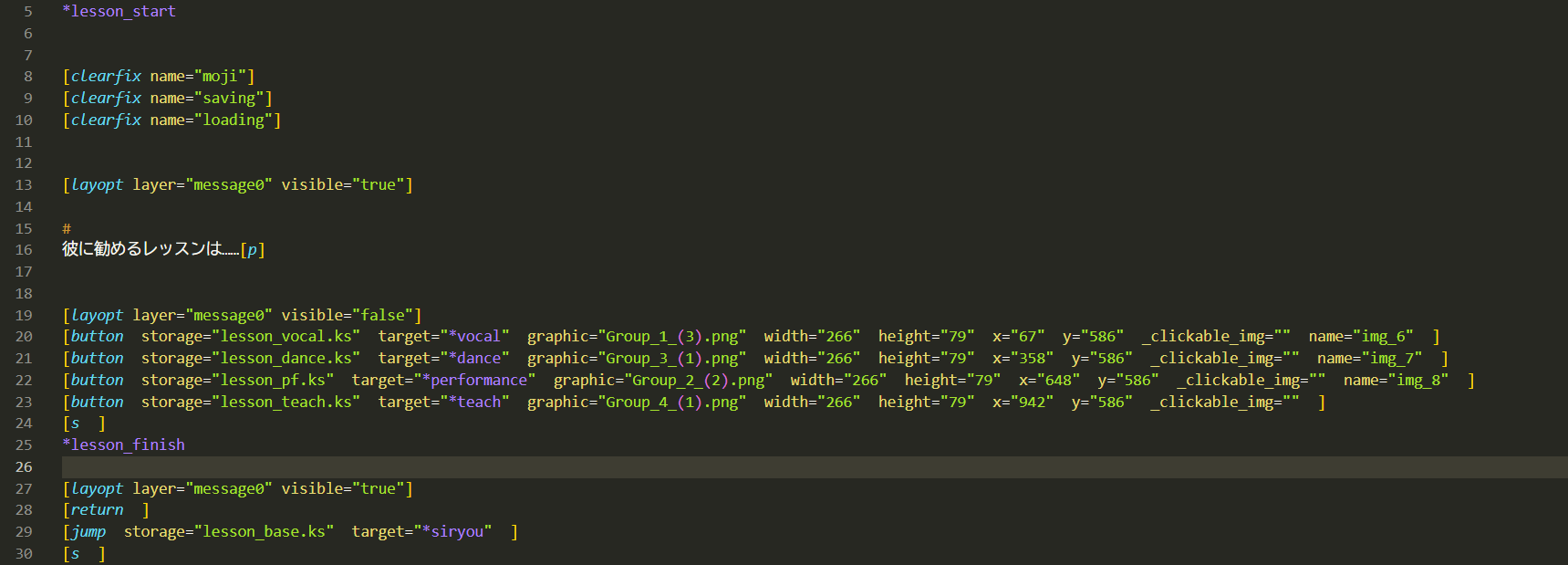 パッと見だとなんのこっちゃかもしれませんが、ここでレッスン開始から終了までの大枠を作っています。レッスン開始を知らせるメッセージを出した後、選択ボタンを4つ表示。押されたボタンに対応したシナリオファイルへ飛んでいきます。ファイル先でイベント処理が終わったら*lesson_finishラベルに戻ってきて、「リターン」で進行中のシナリオファイルへ戻っていく…という仕組みです。