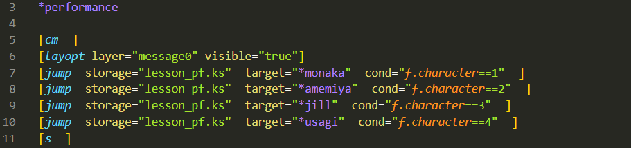 レッスンパート開始前にキャラクターごとの変数を割り振ってあるので、キャラに合わせたイベントへ自動でジャンプしてくれます。