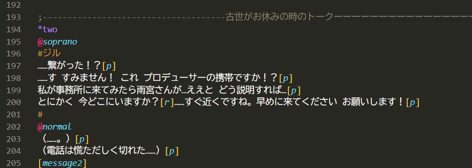 @sopranoがアイドル用、@normalがプロデュ―サー用の音程変更マクロです。プロデュ―サーが喋るたびに変更タグを入れなければいけませんでした。